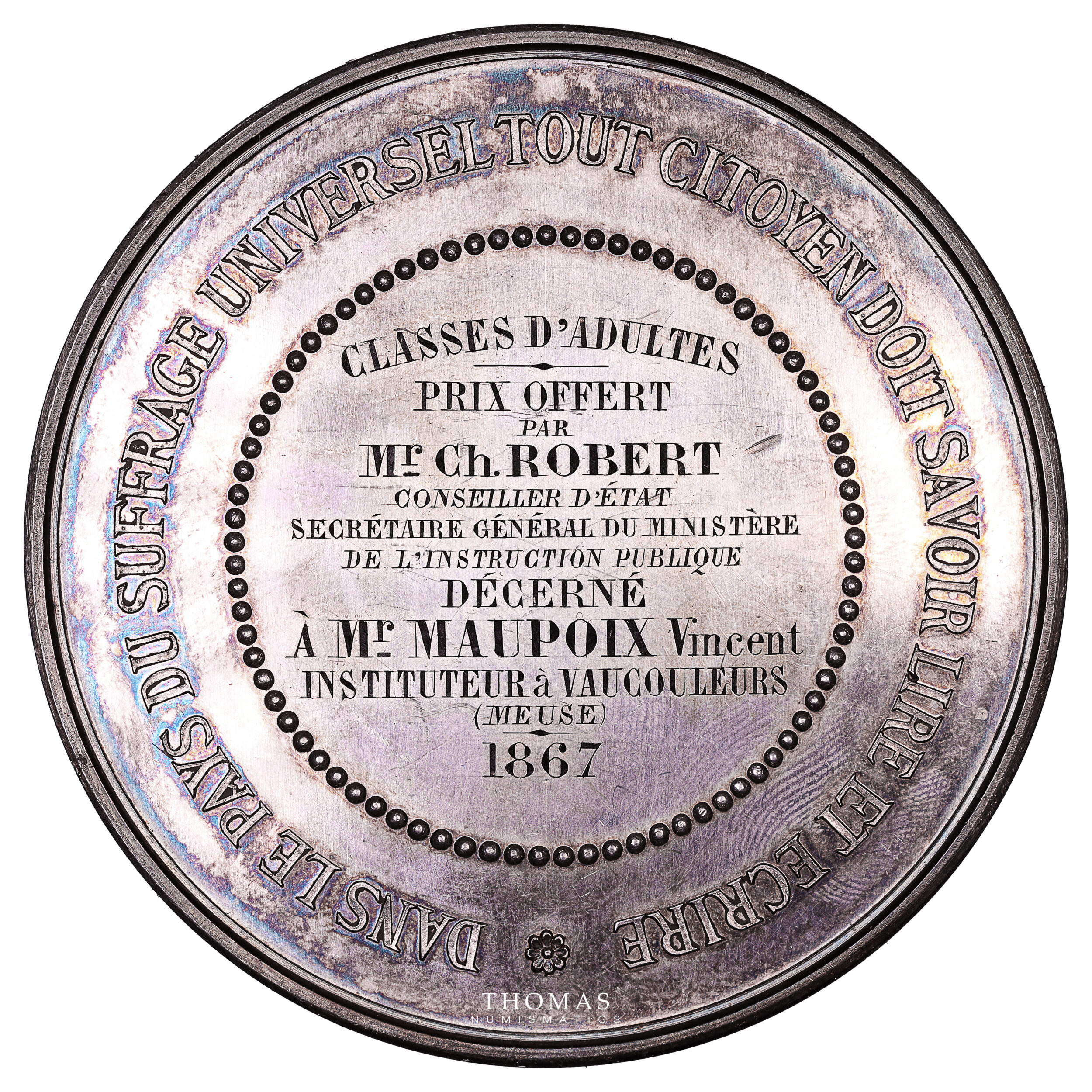 Revers : Dans le pays du suffrage universel tout citoyen doit savoir lire et écrire. Classes d'adultes. Prix offert par Mr Ch.ROBERT, Conseiller d'État Secrétaire général du Ministère de l'Instruction Publique.