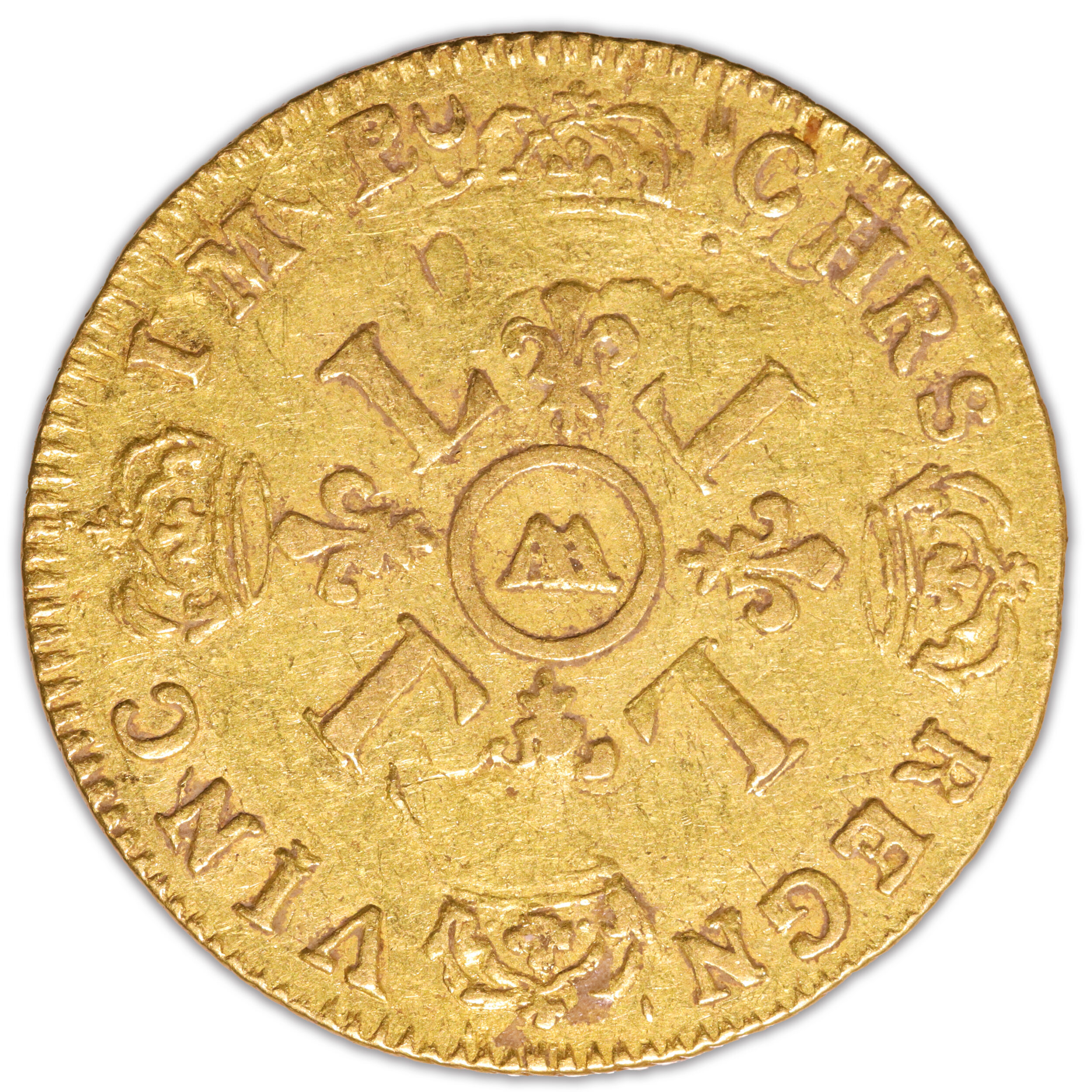 Louis d’or provenant du célèbre Trésor de Valenciennes, découvert par le terrassier Giuseppe Corrias le 30 août 1949 lors de travaux de reconstruction.