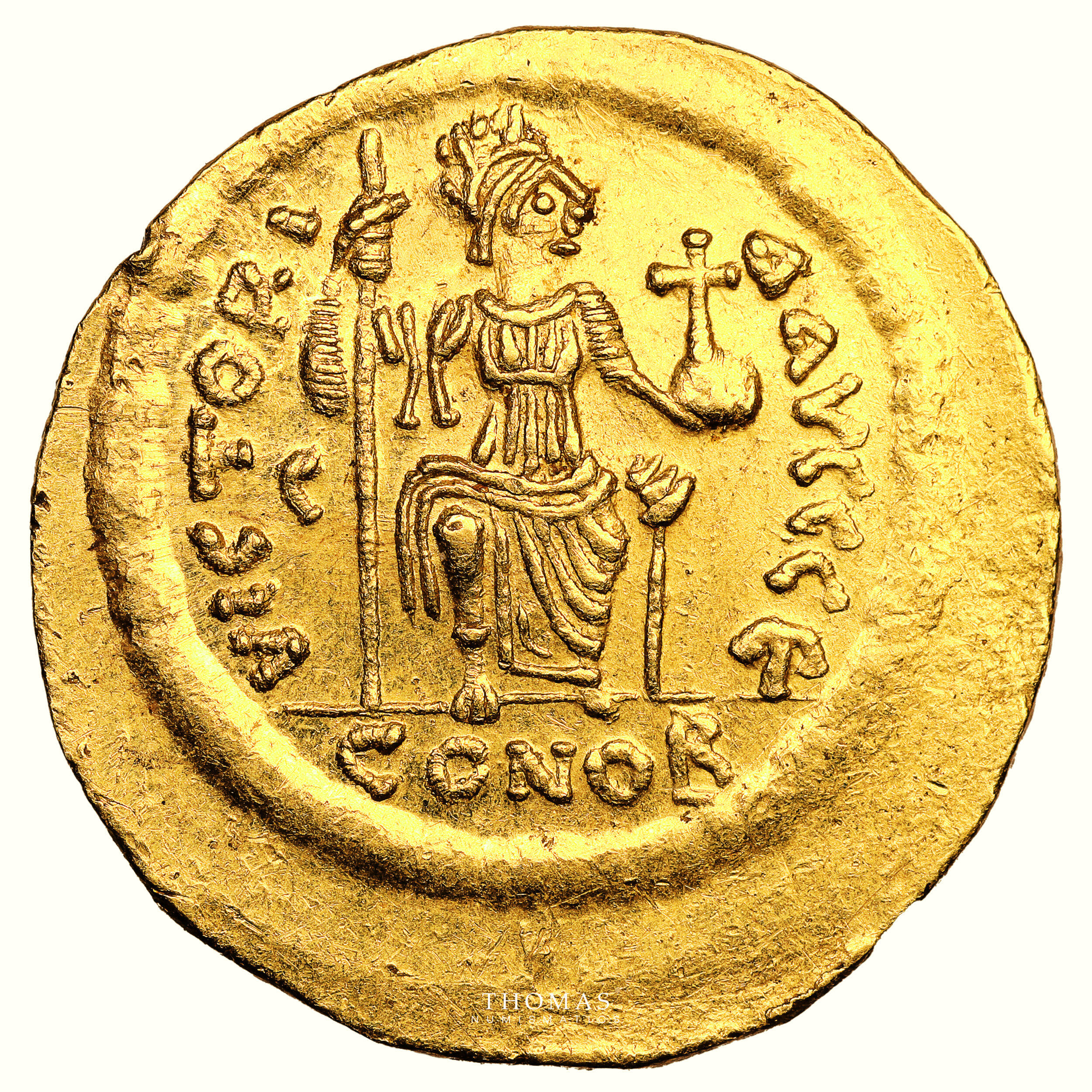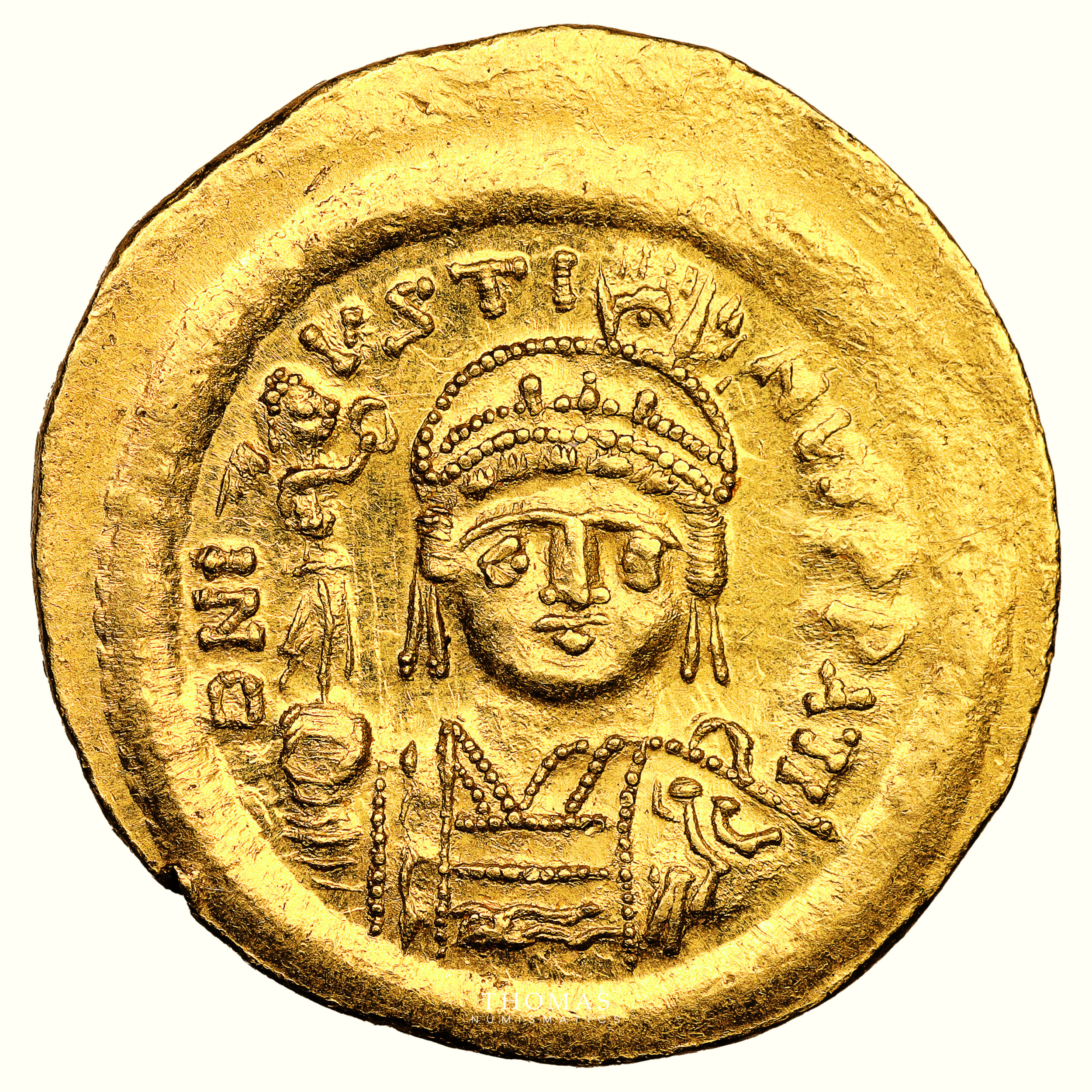 Gold solidus with bright original luster. Superb example with sharp and well-defined detail.