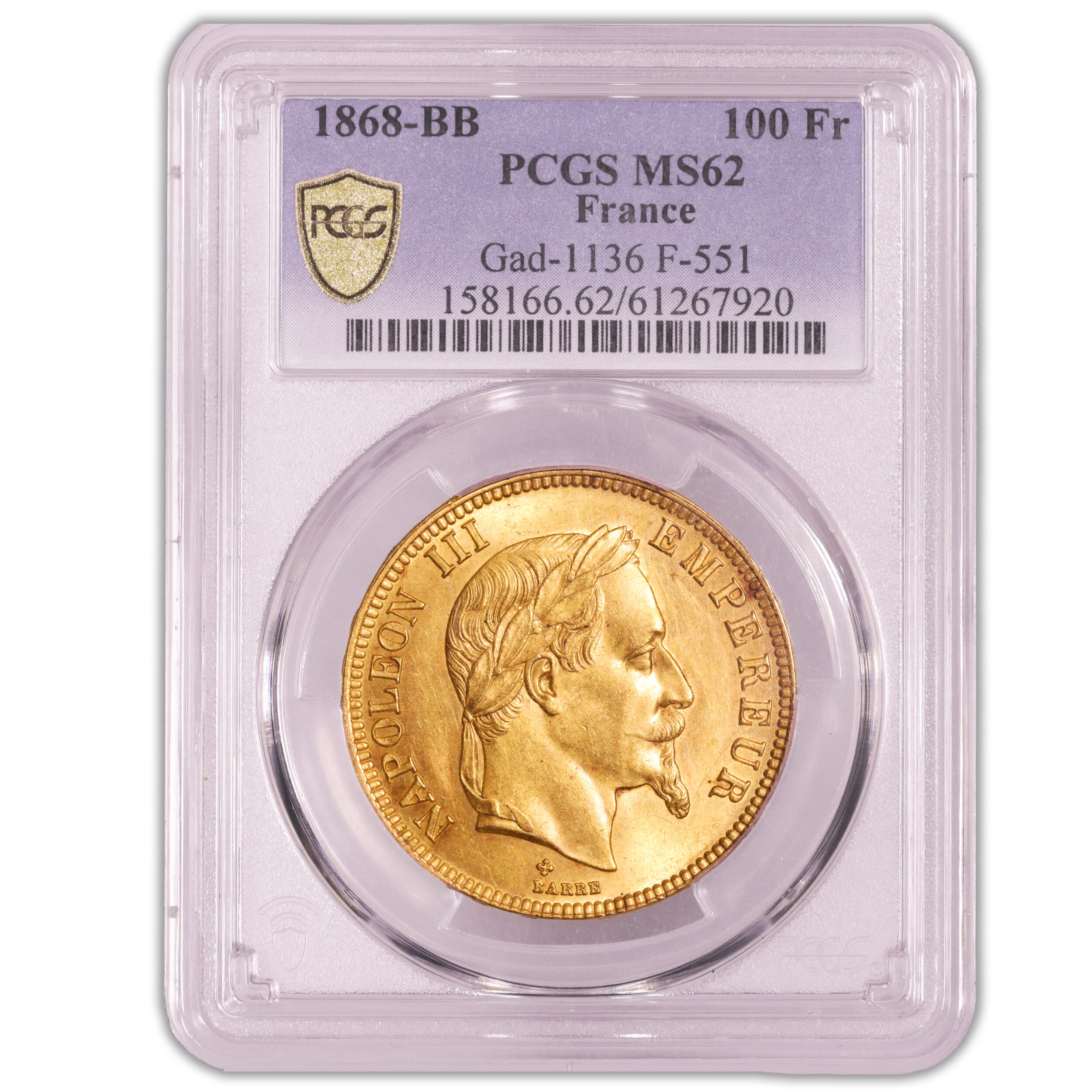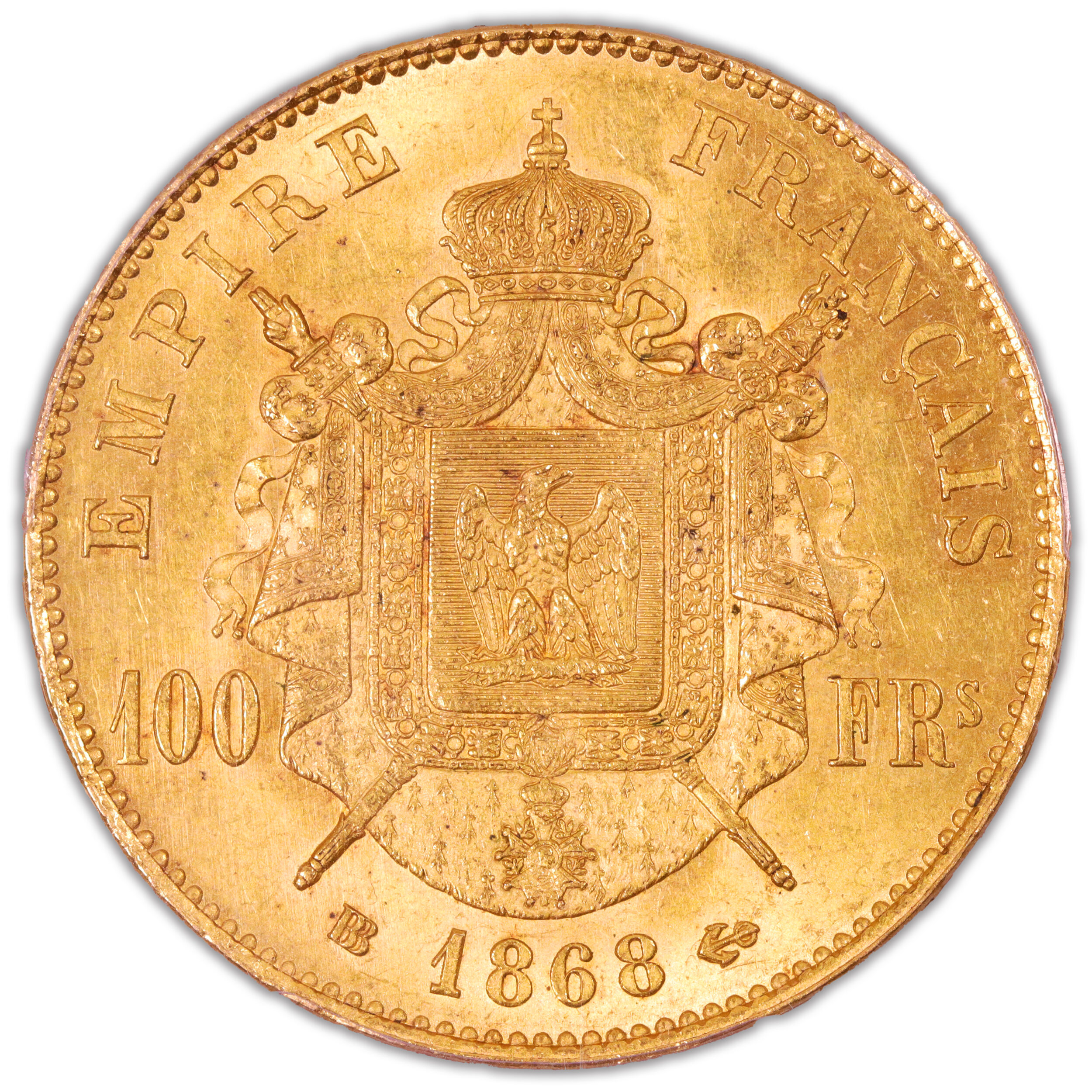 Gold – 100 francs or – tête laurée – 1868 BB Strasbourg – PCGS MS 62 – 1982 examples