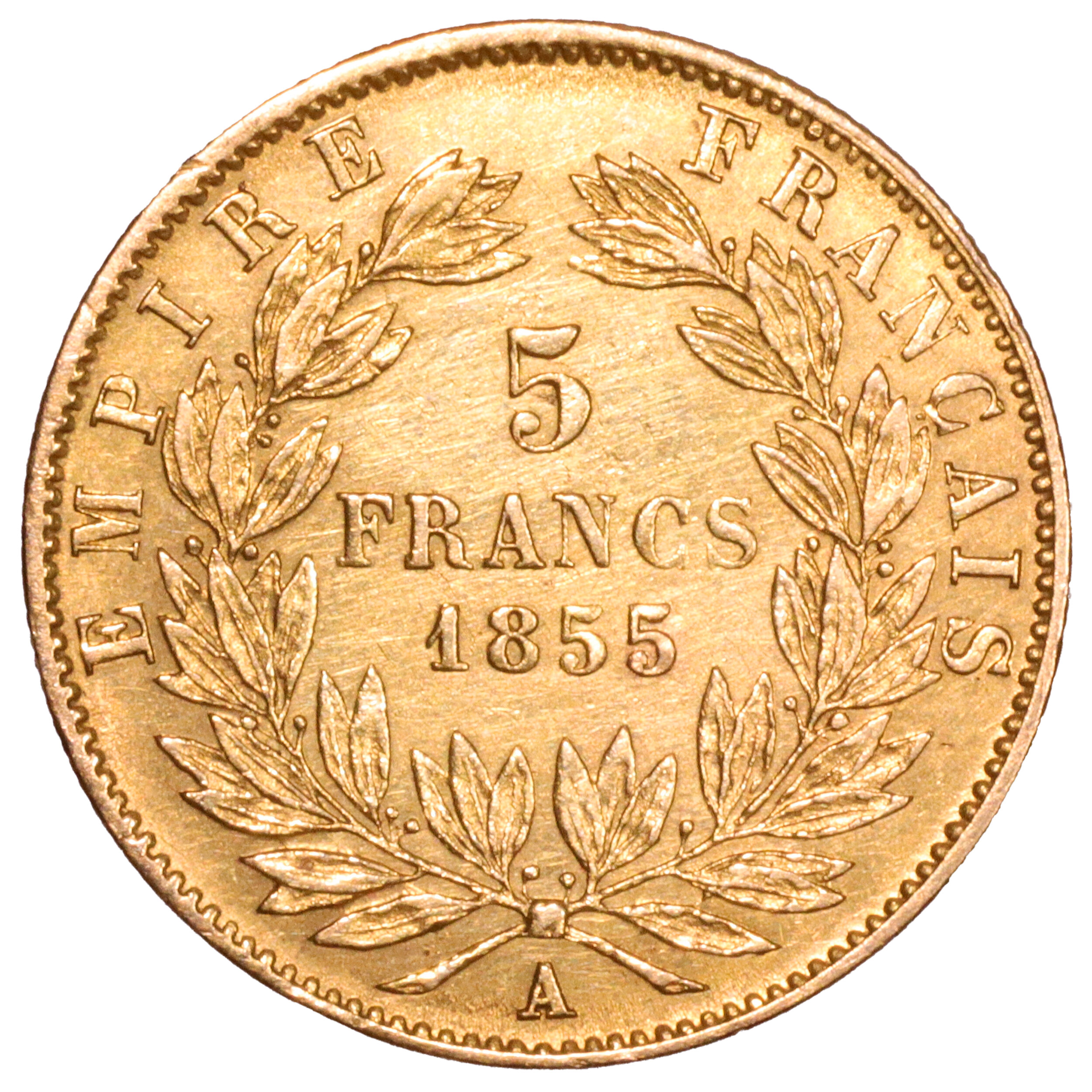 The 1855 A gold 5 francs is the rarest issue of the entire series of gold 5-franc denominations struck under Napoleon III.