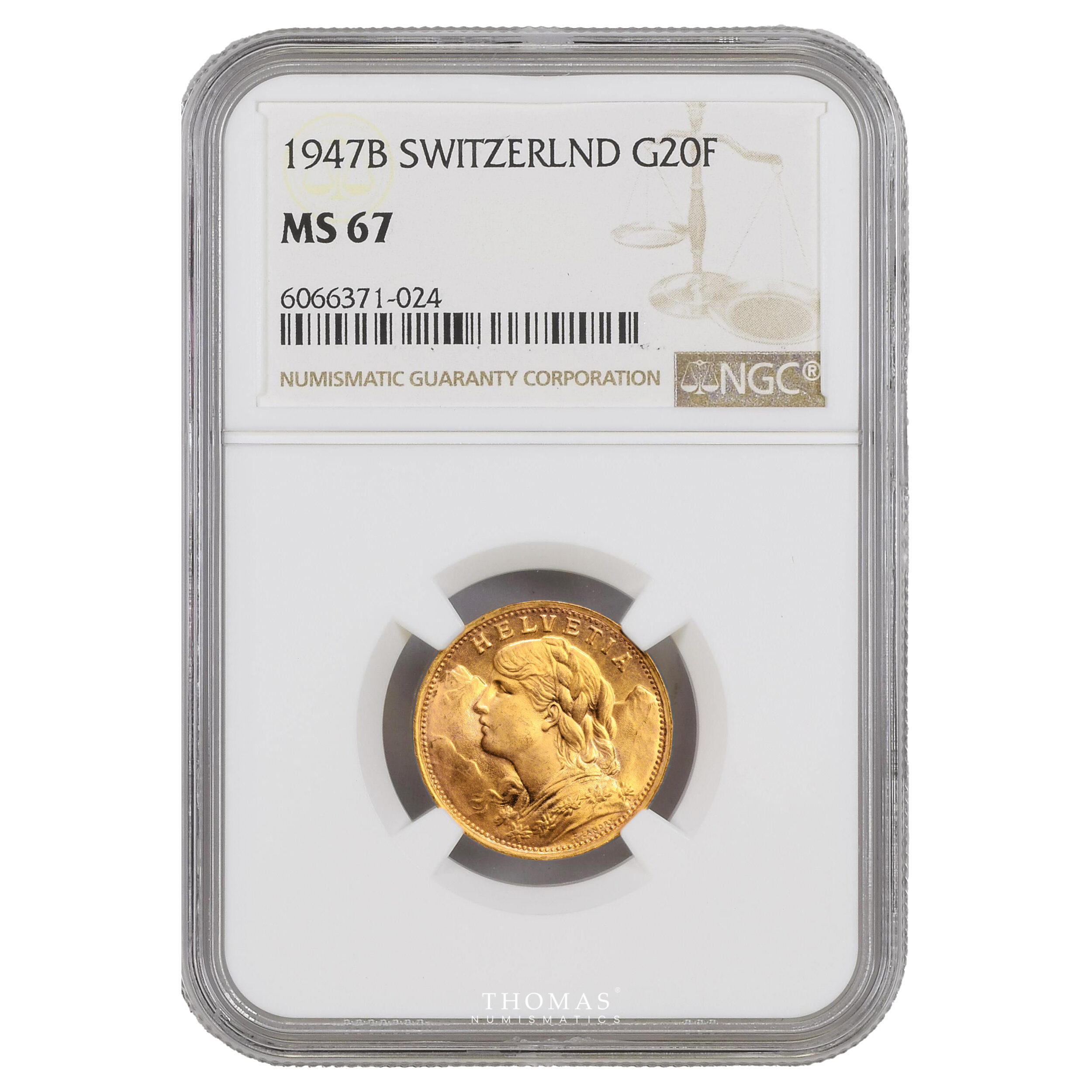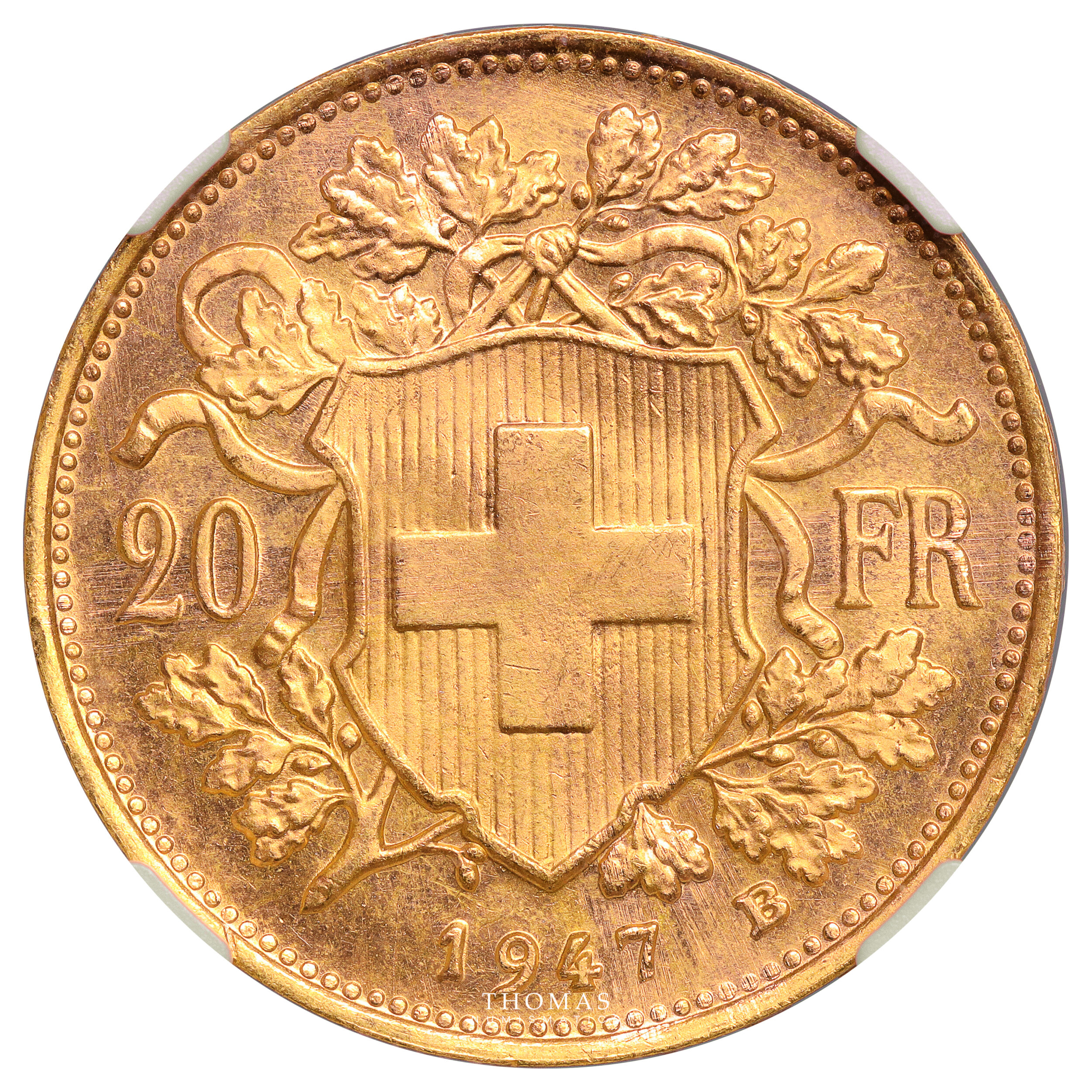 Gold – 20 Francs or Vreneli – 1947 B Bern – NGC MS 67